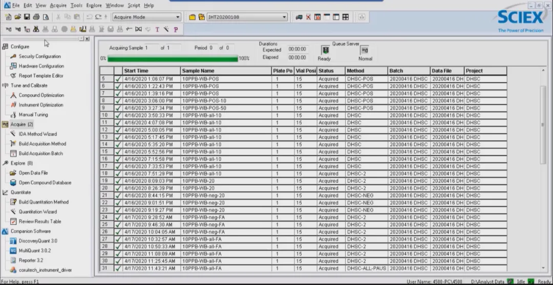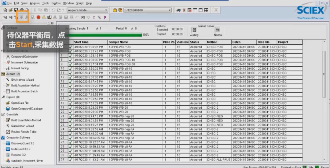 12. 开始采集数据:当质谱变为 Ready 状态后,就可点击 (Start Sample)按钮开始采集数据。