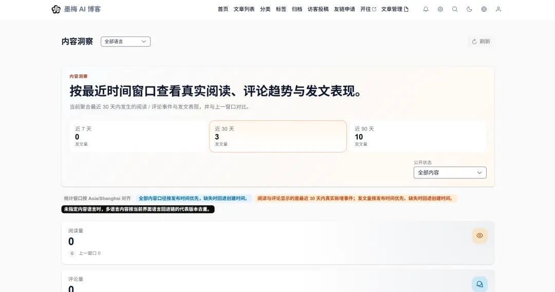 新增内容洞察页面,可以查看最近的阅读量、评论量、发文量的统计。