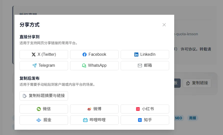 文章页面添加了分享功能,可以一键分享到社交媒体,也可以复制后分享。