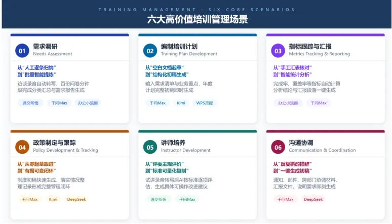 不讲AI原理与技术参数,只讲需求调研、计划编制、讲师培养、指标跟踪等培训管理真实工作场景下的AI提效方案。每个场景从"现在怎么做"出发,直接落到"用AI怎么做"。