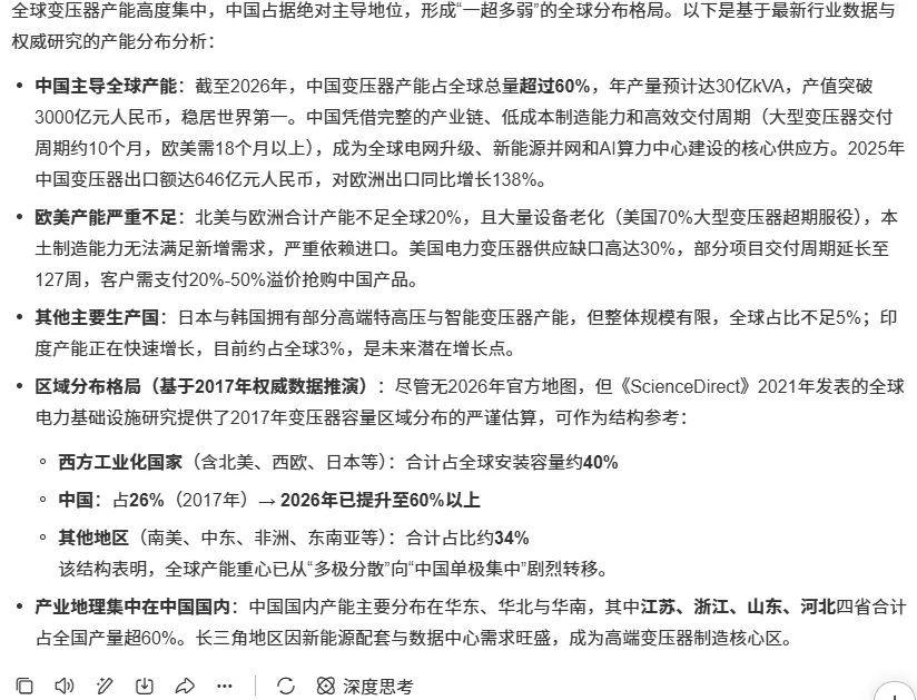 咱们先看几组数,不是什么宏大叙事,就是实打实的行业情况。我翻了财联社去年12月的报道,全球六成以上的变压器产能都在东大,老美那边呢,八成的大型变压器得靠进口,本土也就只能造点小型配电的,还不够自己用。伍德麦肯兹公司给的数更具体,今年老美大型变压器的订单,比能供应的多了大概1.4万台,配电的缺口更夸张,有12.3万台。当然,这些数字是咨询公司给的,不一定特别准,但大方向应该没错。