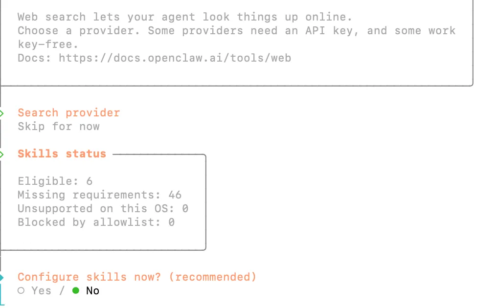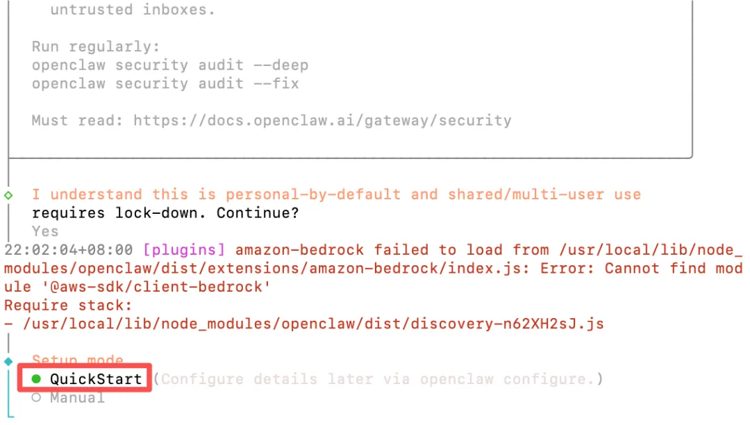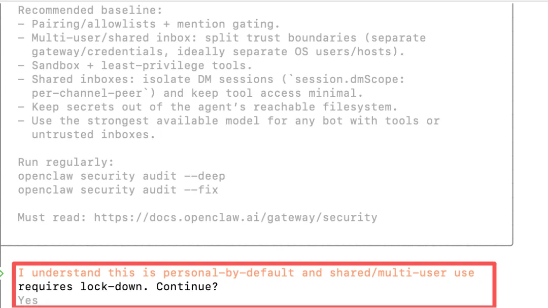 npm install -g openclaw@latest安装完成后,执行以下命令,然后按照引导对openclaw进行初始化设置: