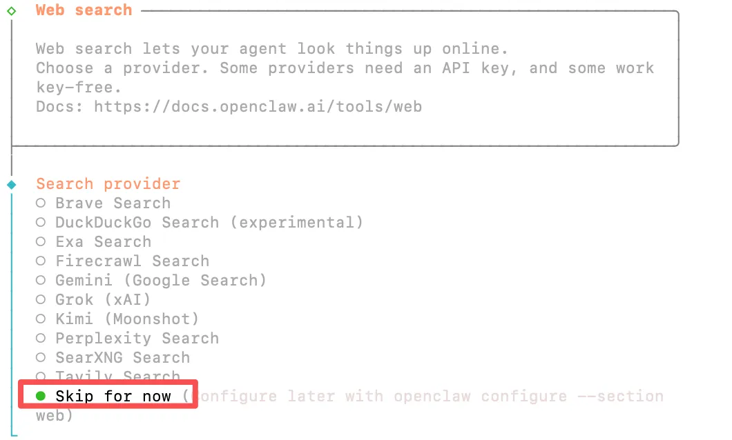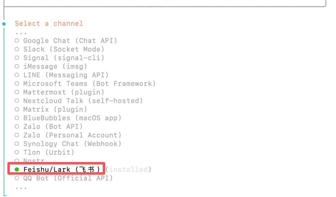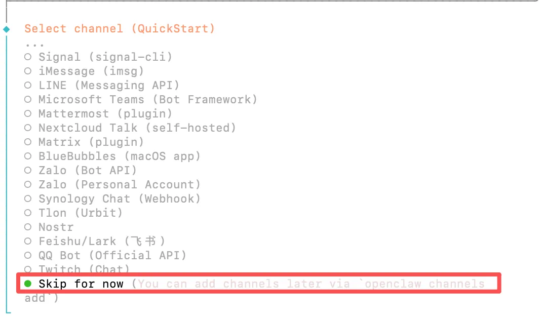 Channel 选择,暂时跳过,后面单独介绍接入飞书和Discord: