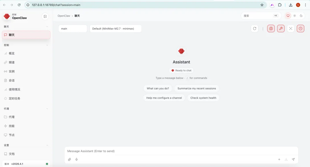 这个就是 OpenClaw Web 端,后面也可以通过 openclaw dashboard 命令来打开。