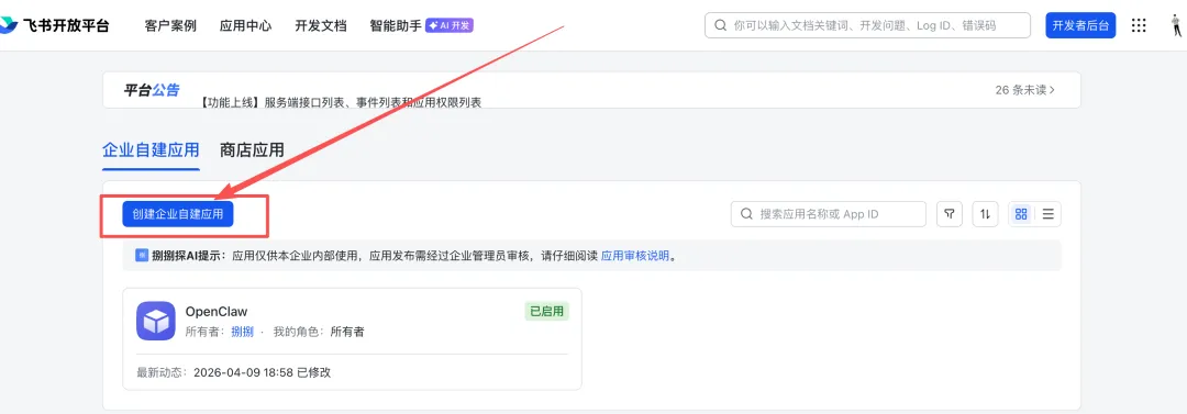 打开飞书开放平台:https://open.feishu.cn/app, 创建新的应用: OpenClaw