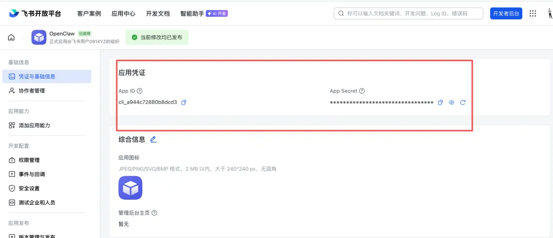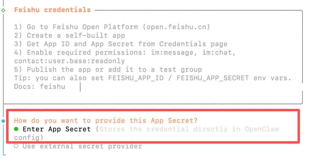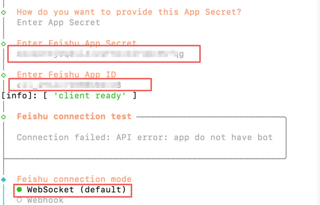 按提示输入创建飞书应用时保存的App ID 和App Secret: