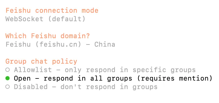 群聊策略选择 Open:允许响应所有的群聊,Allowlist: 在白名单的群聊可以响应。