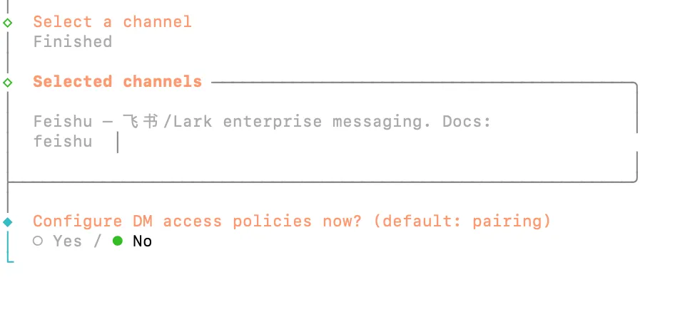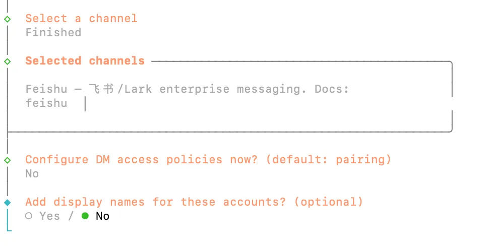openclaw channels add 选择 Feishu/Lark (飞书):