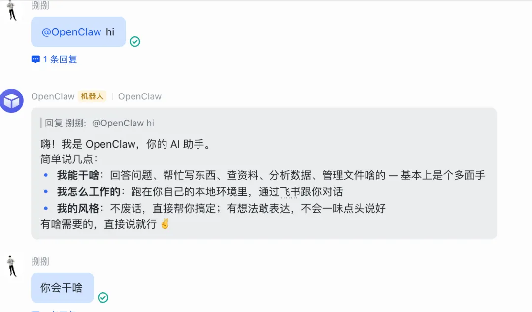OpenClaw 可以正常回复就说明飞书接入成功了。