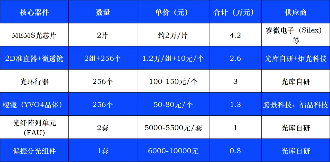 据相关证券纪要,一台32×32通道OCS交换机硬件成本约10万美元,64×64通道成本近似翻倍。整机毛利率约50%,远高于传统光模块(通常25-35%)。扣除毛利润后的成本结构中: