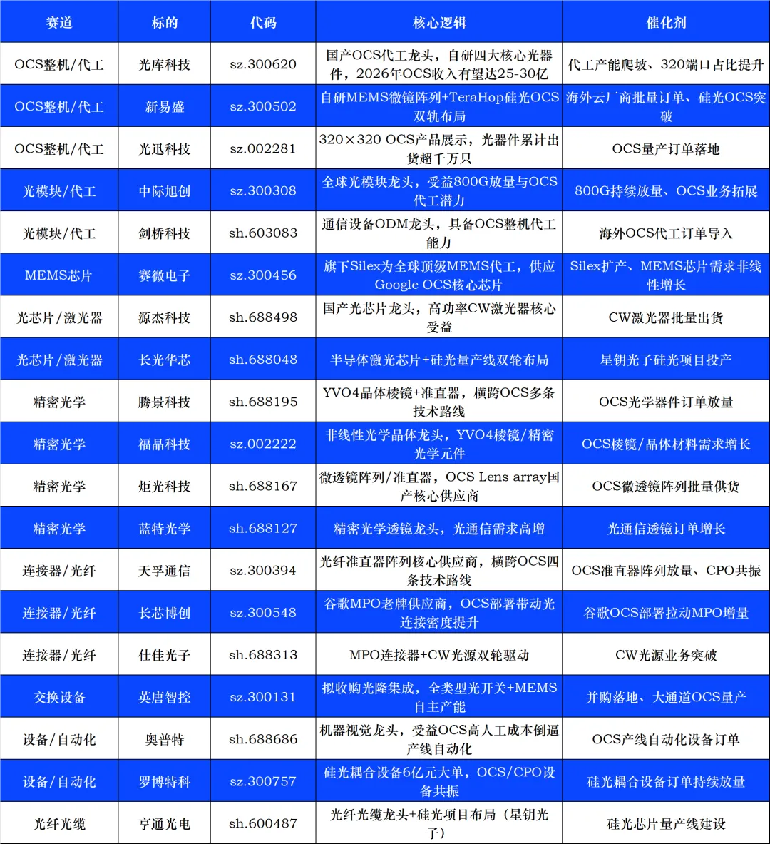核心逻辑:OCS整机出货量全球领先,积压订单超4亿美元,预计2027年实现年化收入超10亿美元 预期差:液晶方案(DLC)路线的独特卡位,与Google MEMS方案形成差异化竞争 催化剂:季度订单持续超预期、新客户(微软/Meta)批量订单落地