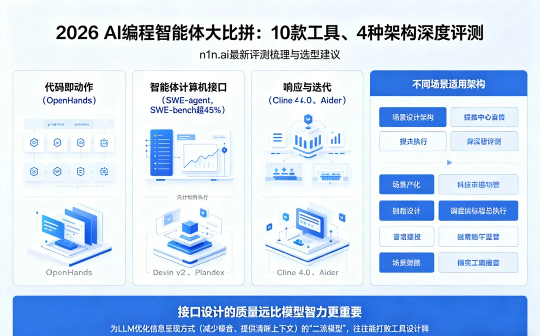 n1n.ai 最新评测梳理出4种主流架构——「代码即动作」(OpenHands)、「智能体计算机接口」(SWE-agent,SWE-bench 超 45%)、「先计划后执行」(Devin v2、Plandex)、「响应与迭代」(Cline 4.0、Aider)——并给出不同场景的选型建议。