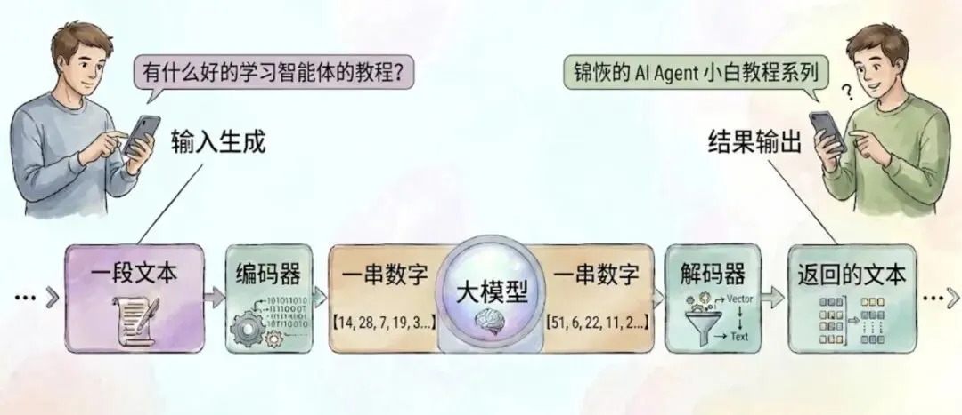 「有什么好的学习智能体的教程」-> 把这串文字搞成数字(一般是长度略低于输入字数的一串数字)-> 输入大模型 f(x),计算得到结果 -> 把这串数字搞成文本 -> 「锦恢的 AI Agent 小白教程系列」