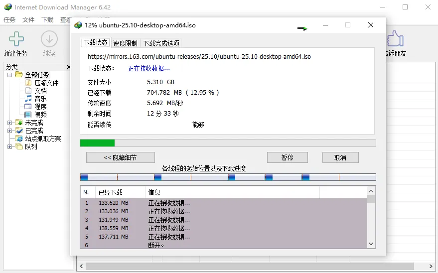 IDM的强大不止于速度,它的智能分段下载功能会自动将大文件拆分成多个小段,同时从服务器的不同节点获取数据,不仅加快了速度,还能有效降低传输错误率。遇到网络中断、电脑死机等突发状况也不用慌,IDM的断点续传功能会精准记录下载进度,恢复网络后直接从断点处继续,避免重复下载浪费时间。