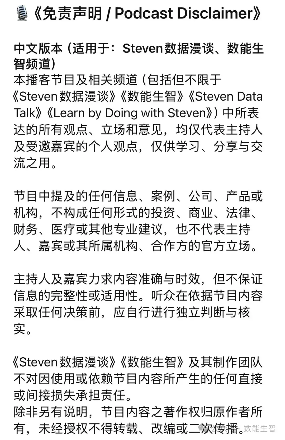 《Steven数据漫谈》——用最清晰的方式,聊最前沿的人工智能、科技、创新、商业、创业思考。现已登陆 Spotify、Apple Podcasts、YouTube、Amazon Music、小宇宙、喜马拉雅 等平台。