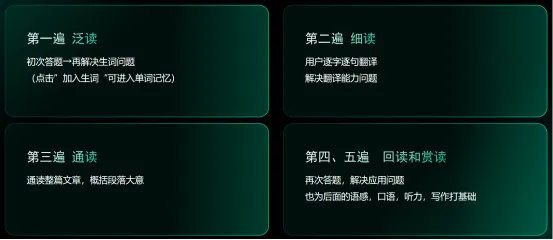 通过五步递归研读法,泛读、细读、通读、回读和赏读之后,让孩子解决应用问题,不再为完型题苦脑。也为后面的语感,口语,听力,写作打基础。