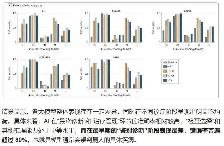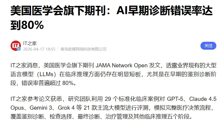 最新数据显示:AI在初步诊断环节的错误率高达80%。也就是说,你去找AI看病,10次里面有8次,它给的第一版诊断是错的。