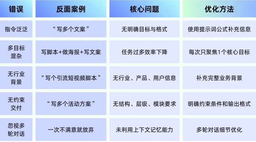 但90%的人都会犯提示词错误。窦伟老师总结了5个常见坑及优化方法: