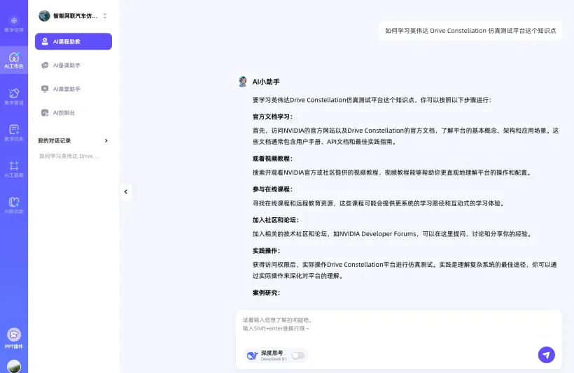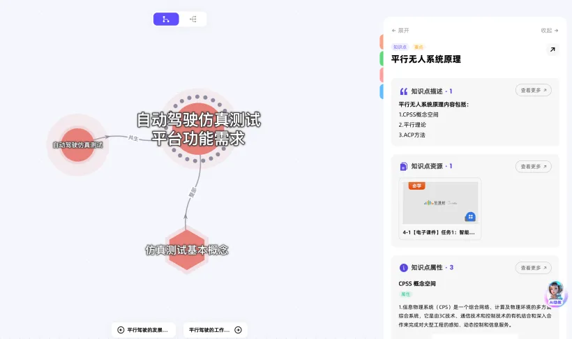 智慧课程全国共享运行,实现课程数字化教学资源全国跨校共享应用,以可视化的方式展现知识关系网络,以结构化的形式描述课程内所包含的知识点、教学资源、教学活动、测评方式之间的关系,具有知识管理、学习导航、学习评估等功能,帮助学生更全面、更系统地了解课程知识点、教学资源、AI辅助智能问答,同时通过引入DeepSeek-R1互动助手,动态强化知识记忆,激发学习兴趣,精准定位薄弱环节,实现效率提升与个性化学习闭环。