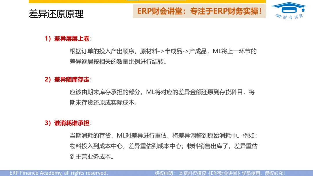谁消耗谁承担:当期消耗的存货,ML对差异进行重估,将差异调整到原始消耗中。例如:物料投入到成本中心,差异重估到成本中心;物料销售出库了,差异重估到主营业务成本。