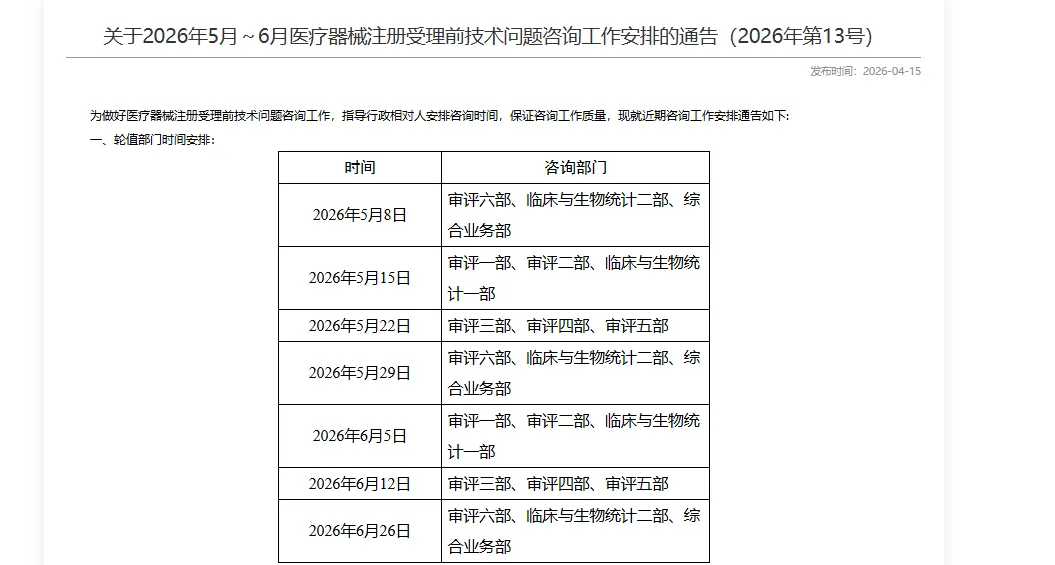 3.国家药品监督管理局关于2026年5月~6月医疗器械注册受理前技术问题咨询工作安排的通告(2026年第13号)。