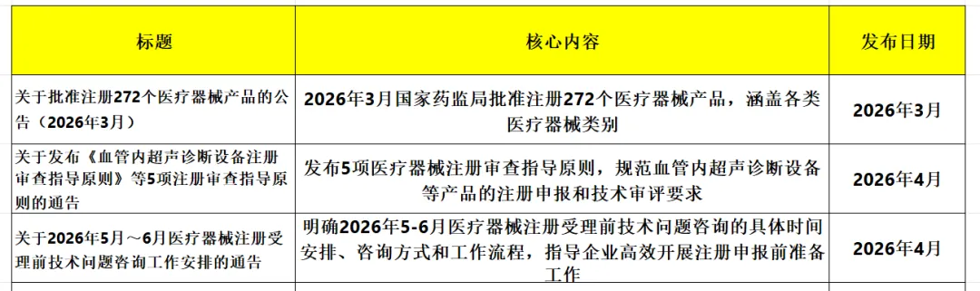 1.国家药品监督管理局关于批准注册272个医疗器械产品的公告(2026年3月)。
