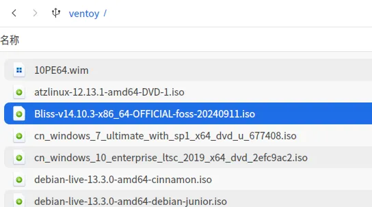 一个 U 盘(≥8G 就行) 电脑上装好 Ventoy系统安装器 下载好Bliss-v14.10.3-x86_64-OFFICIAL-foss-20240911.iso 的 ISO 文件拷贝到Ventoy盘的ventoy文件下。