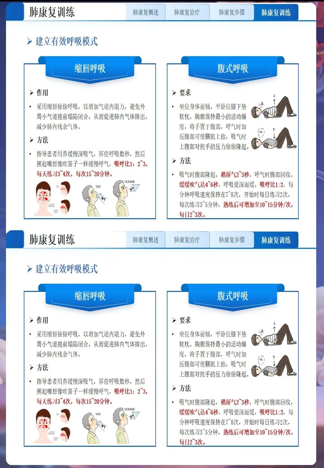 呼吸训练是肺康复的核心内容,首先要教的是腹式呼吸。正常情况下人应该是用肚子呼吸的,吸气时肚子鼓起来、呼气时肚子瘪下去,但很多呼吸疾病患者习惯用胸式呼吸,肩膀耸得老高,呼吸浅快又费力。教腹式呼吸要一步步来,让患者一手放胸口、一手放腹部,吸气时腹部鼓起、胸部不动,呼气时腹部收缩