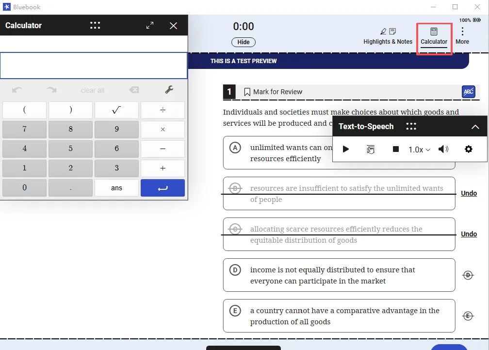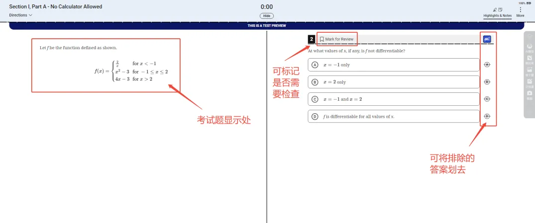 做题时,学生可以利用Bluebook内置的以下功能辅助自己作答:添加高亮、标记被排除的选项、添加笔记等。
