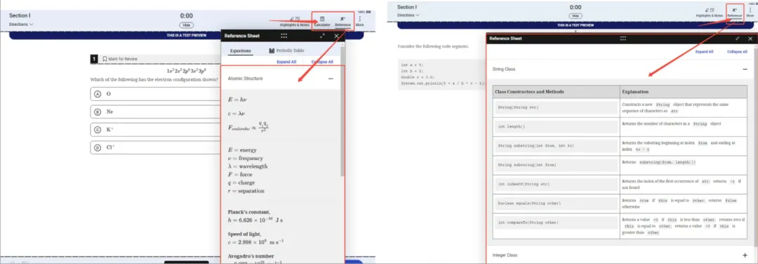 根据学科的不同,Bluebook还提供了不同的工具,如在AP计算机科学A中会提供参考代码、在AP生物会提供计算器和公示表、在AP化学中提供公示表和元素周期表等。