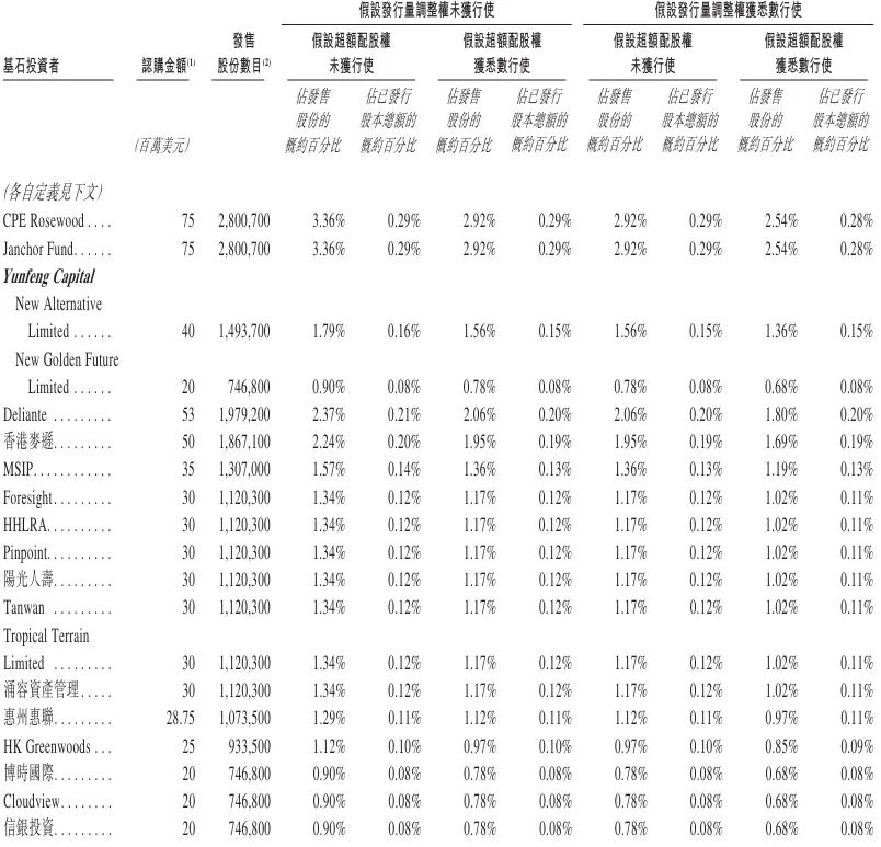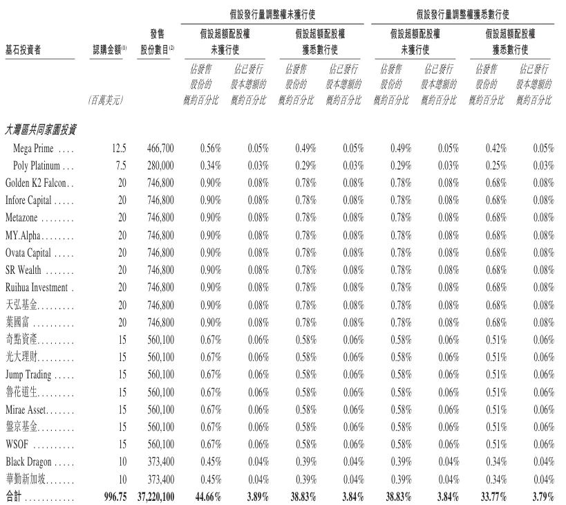基石投资者方面,本次IPO吸引摩根士丹利MSIP、高瓴HHLRA、CPE Rosewood、云锋基金、Janchor Fund、HK Greenwoods、韩国未来资产(Mirae Asset)、信银投资、阳光人寿、华勤新加坡、博时国际、光大理财等38家知名机构担任基石投资者,合计认购约9.97亿美元。
