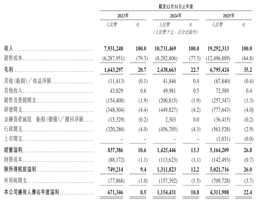 经营业绩方面,2023-2025年,公司营业收入分别为人民币79.31亿元、107.31亿元和192.92亿元;同期净利润分别为6.713亿元、11.544亿元和43.12亿元;同期毛利率分别为20.7%、22.7%和35.2%。
