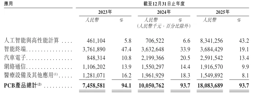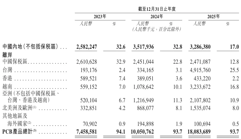 客户方面,胜宏科技累计服务客户超过700家。2023-2025年,公司对前五大客户的销售额分别为人民币21.456亿元、26.905亿元及98.476亿元,占各期总收入的27.1%、25.1%及51%。同期,对最大客户的销售额分别为人民币5.035亿元、8.864亿元及57.379亿元,占比分别为6.3%、8.3%及29.7%。