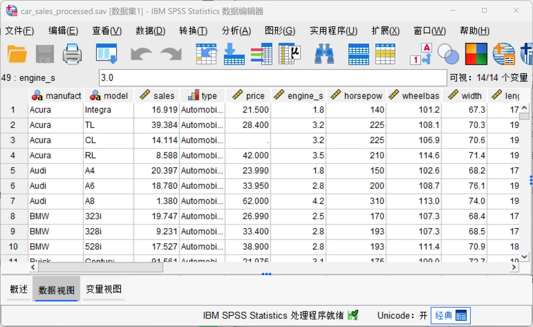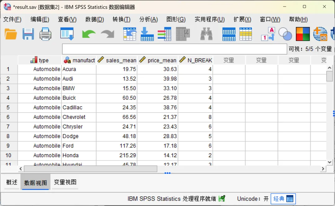 设置完成,点击确定,SPSS将执行汇总操作。打开保存的只包含汇总变量的新数据文件,在该文件中,数据结构清晰明了: