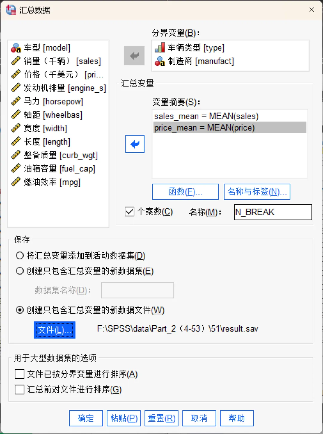 ③、创建只包含汇总变量的新数据文件:将汇总数据保存到一个外部数据文件中。该文件包括定义汇总个案的分界变量以及所有由汇总函数定义的汇总变量。当前数据集不受影响。