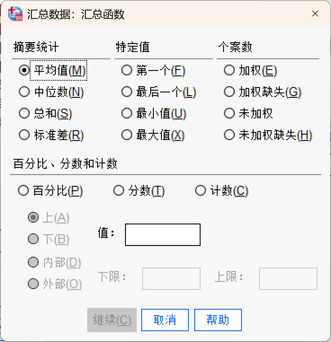 在「汇总变量」列表中,选择希望为其指定不同函数的变量,单击「函数」按钮。在「汇总函数」对话框中选择所需的函数,所选函数将被分配给「汇总变量」列表中选定的变量。可用的汇总函数包括: