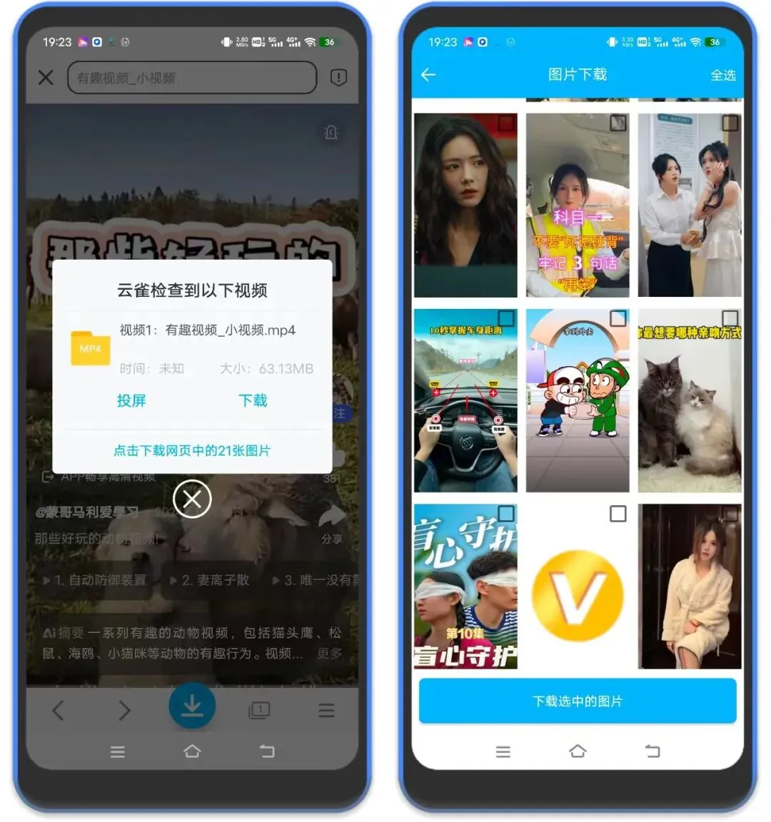 2、视频打开后稍等一下会自动解析当前页面的视频和图片,点击下载就可以下载到相册中。