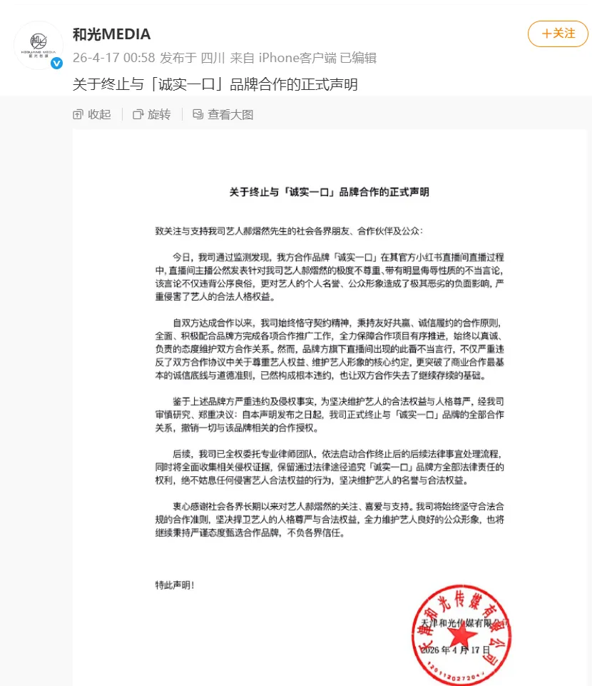4月16日,宠物食品品牌诚实一口因直播间主播发表针对代言人郝熠然的不当言论引发舆论哗然,涉事主播公然贬低艺人,引发粉丝强烈不满。事发当日,诚实一口发布致歉声明,称相关言论仅为主播个人行为,品牌对此零容忍;已第一时间关停涉事直播间、开除涉事主播、严肃问责管理团队,并表示将全面升级主播管理与内容审核流程,杜绝同类问题再次发生。4月17日,艺人经纪公司和光MEDIA发布终止合作声明,指出品牌方相关行为侵害艺人人格权、违反合作协议,严重损害艺人公众形象,宣布即刻终止与诚实一口的全部合作,并将通过法律途径维护艺人合法权益。(来源:新浪微博@和光MEDIA、新浪微博@诚实一口)