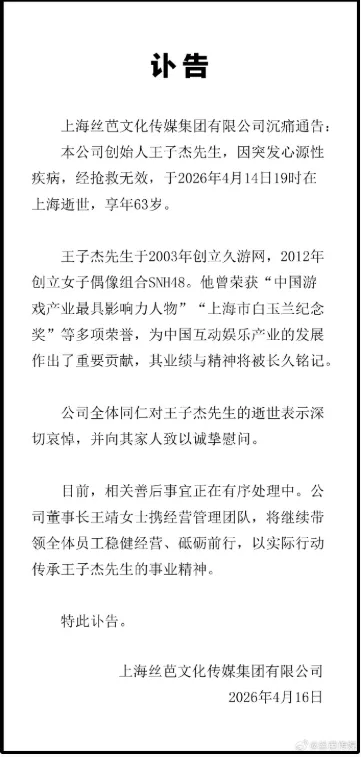 4月16日,上海丝芭文化传媒集团发布官方讣告,证实创始人兼总裁王子杰因突发心源性疾病,经全力抢救无效,于4月14日19时在上海逝世,享年63岁。据悉,王子杰在公司会议中突感心脏不适倒地,虽经紧急送医救治,但因病情凶险最终离世。讣告发布后,多位现役及已离开丝芭的艺人发文悼念。许佳琪称其为“大家长”,感恩其关心与栽培;黄婷婷、林思意等前成员也发文感念过往提携之恩,称"从没忘记来时路上的栽培与提携"。业内好友亦纷纷发声,追忆与王子杰并肩奋斗的岁月,缅怀这位中国偶像产业的开拓者。(来源:新浪微博@丝芭传媒)