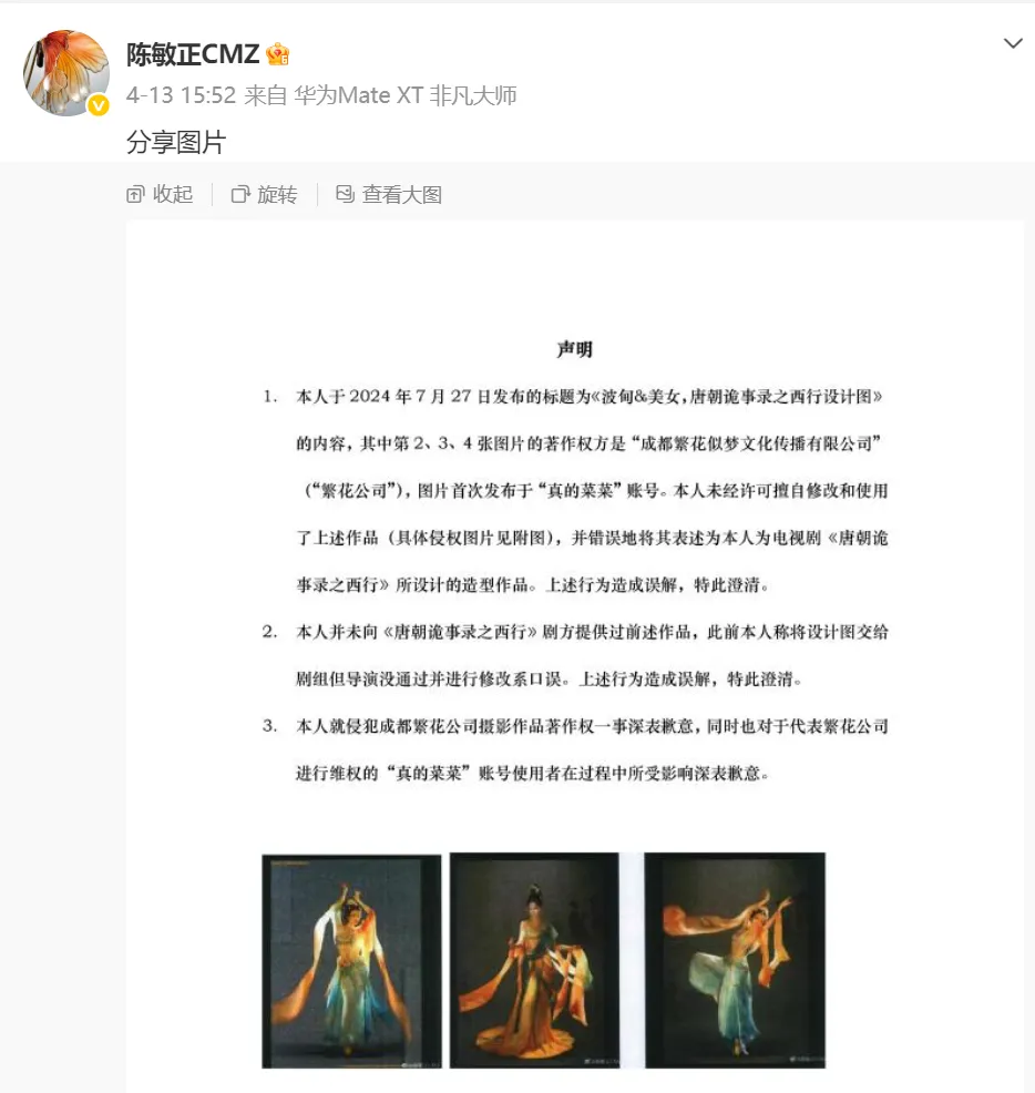 4月13日,博主“真的菜菜”公布维权结果,其诉《唐朝诡事录之西行》造型指导陈敏正盗用原创摄影作品一案历时近两年终胜诉,陈敏正公开致歉。2024年7月,陈敏正在社交平台发布该剧造型设计图,被指盗用“真的菜菜”2021年为原创汉服品牌拍摄的摄影作品,仅通过换背景、换头处理,便冒充个人原创设计,涉案作品著作权归成都繁花似梦文化传播有限公司所有。事发后,“真的菜菜”及所属公司坚决维权。胜诉当日,陈敏正发布声明,承认未经许可擅自修改使用涉案作品,谎称系剧集造型设计,澄清未向剧方提供该作品,此前相关表述为口误,并就侵权行为向版权方及博主致歉。(来源:新浪微博@真的菜菜、新浪微博@陈敏正CMD)