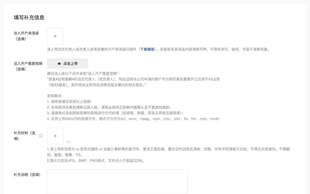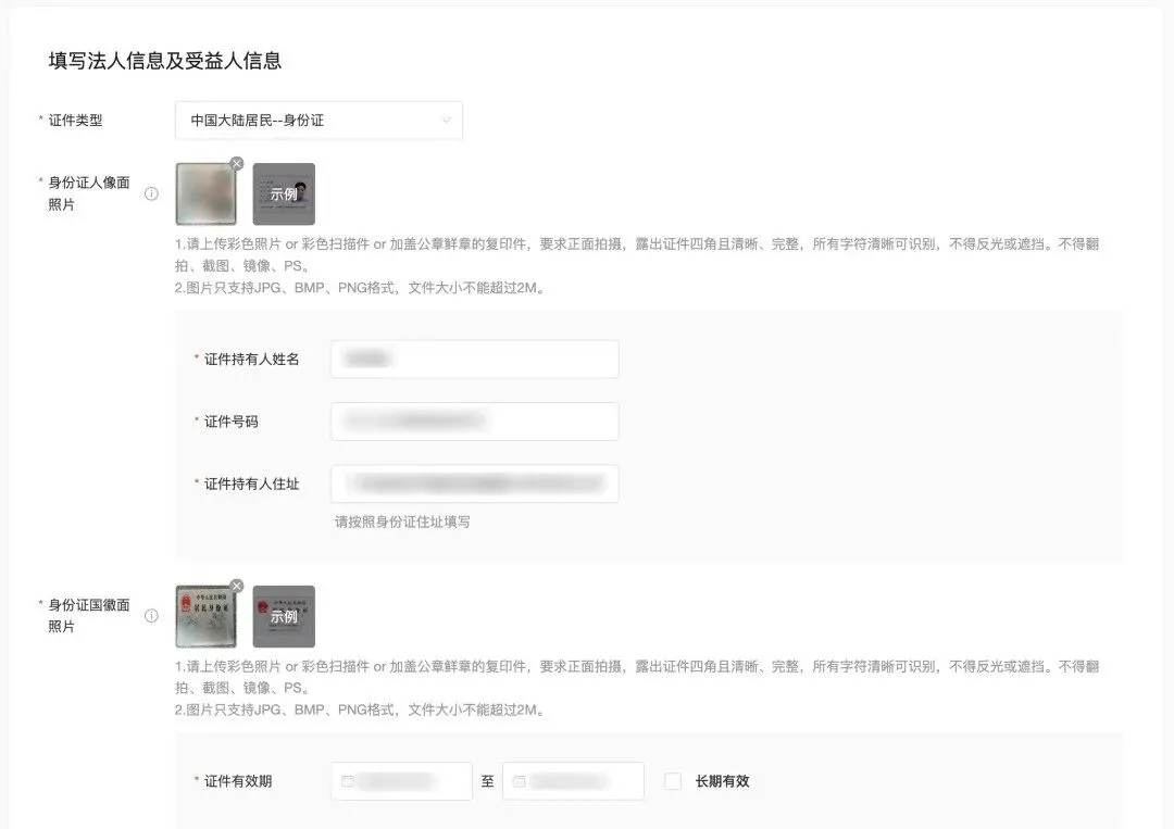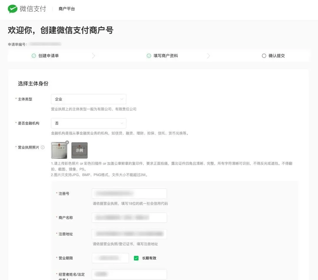 根据你的情况选择主体类型(企业、个体工商户、政府/事业单位等),并上传营业执照照片,系统会自动识别并填写注册号、商户名称、注册地址、营业期限、法定代表人等信息。