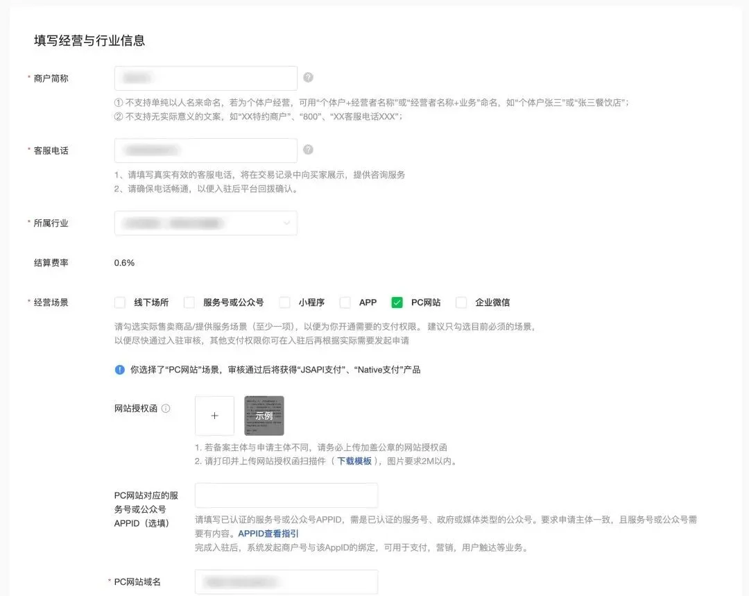 请选择你所在的行业,不同行业的结算费率不同,通常为 0.6% 或 1%。建议只勾选你当前实际需要的经营场景,后续可随时新增。