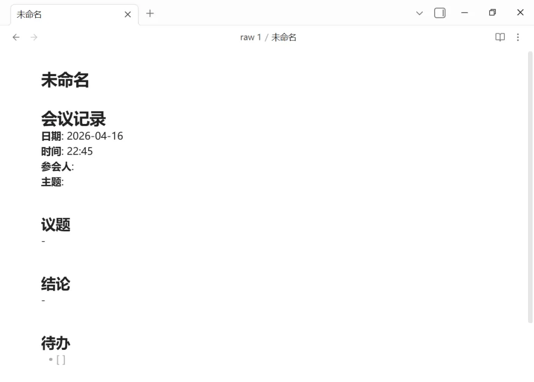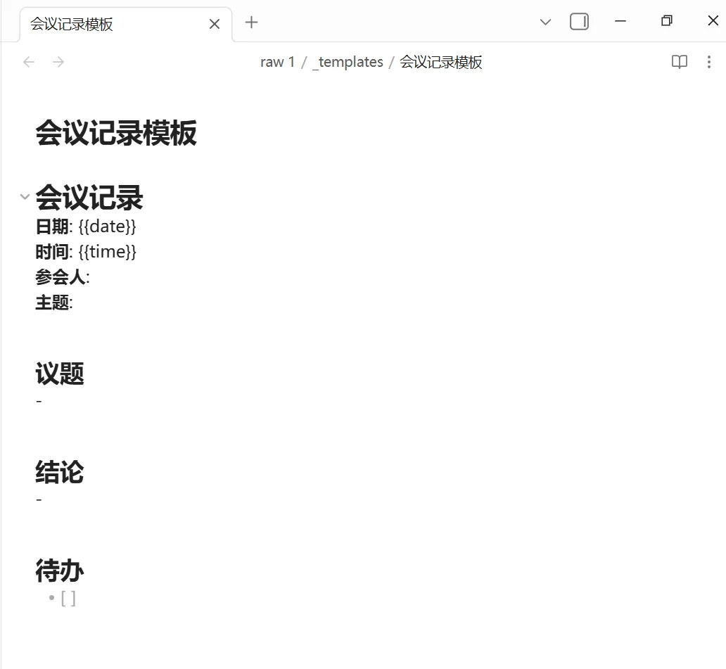 # 会议记录**日期**: {{date}}**时间**: {{time}}**参会人**:**主题**:## 议题-## 结论-## 待办- [ ]