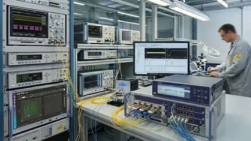 应力接收器灵敏度(SRS)测试评估光学收发器模块的接收器部分是否能在IEEE规范定义的最坏情况信号条件下正确运作。在SRS程序期间,包括校准的正弦抖动、高斯随机噪声和符号间干扰在内的受控损伤被刻意注入测试信号中,以模拟在已部署光纤跨距上发生的实际通道劣化。Viavi Solutions的ONT-800和ONE LabPro等平台产生这些精确校准的应力条件,以验证接收器电路在指定的前向错误更正前位元错误率阈值(通常为每万到每十万个传输位元一个错误)以下维持效能。