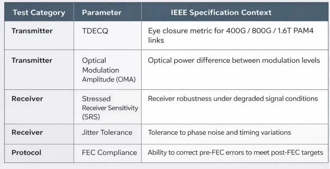 IEEE 802.3标准正式定义的发射器和色散眼闭合四阶(TDECQ)指标,透过相对于理想化参考接收器实作来量测发射器质量的惩罚。虽然Viavi的ONT-800和ONE LabPro等平台可以分析PAM4信号完整性并执行位元错误率特性描述,但正式的TDECQ合规性量测通常需要具有专用IEEE参考接收器算法的高频宽取样示波器。即使是少量的噪声、色散或时序抖动,都可能使眼开口闭合到足以将位元错误率推高至前向错误更正可接受阈值以上的程度。