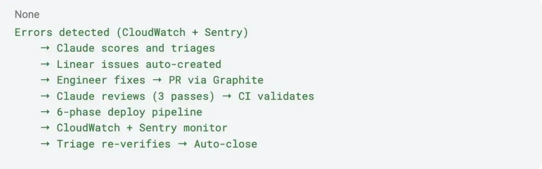 CloudWatch 和 Sentry 检测到错误。 Claude triage 引擎打严重度分,在 Linear 创建带完整调查上下文的 issue。 工程师介入调查。AI 已经完成诊断。工程师验证并推送修复。 走同一套评审、CI、部署、监控流水线。 Triage 引擎再次核验。如解决则工单自动关闭。