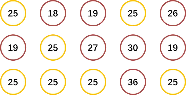 如下图所示,是市场营销人员统计的商品购物消费者的年龄数组,从中可以发现“25”岁出现得最多的次数,即这组数据的众数的是25。