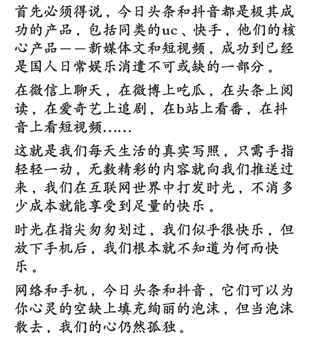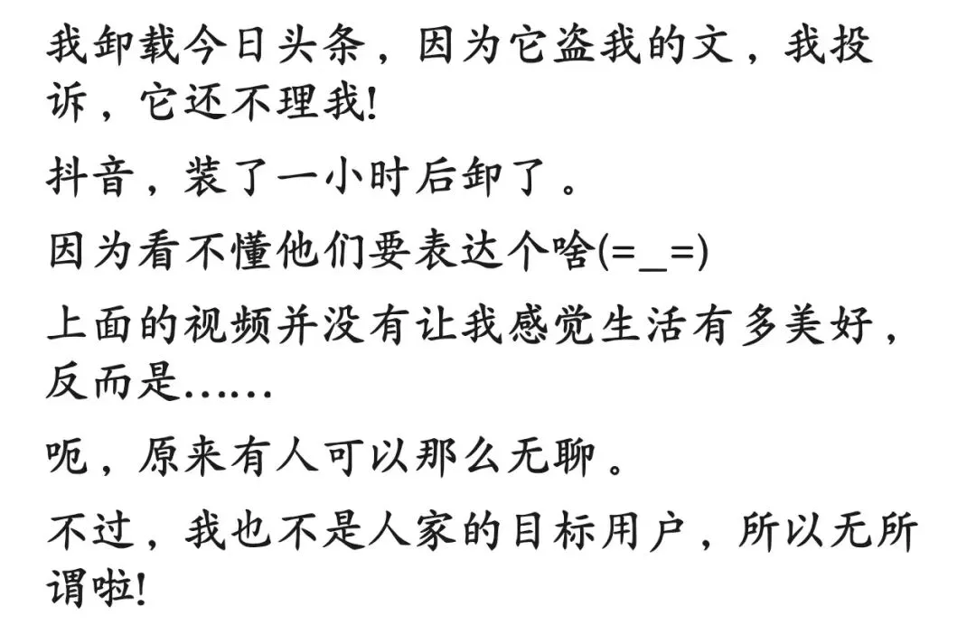 抖音装过一次,看了十几分钟,果断卸载。头条看过一些人发的,直接就没装。其它的有的恐怕也属同类。现在我偶尔能静下心来好好看会书,有时捧本书直接去公园看,手机这东西也得看下怎么处理,现在疫情管控到处看码,不然手机都计划着换功能机了