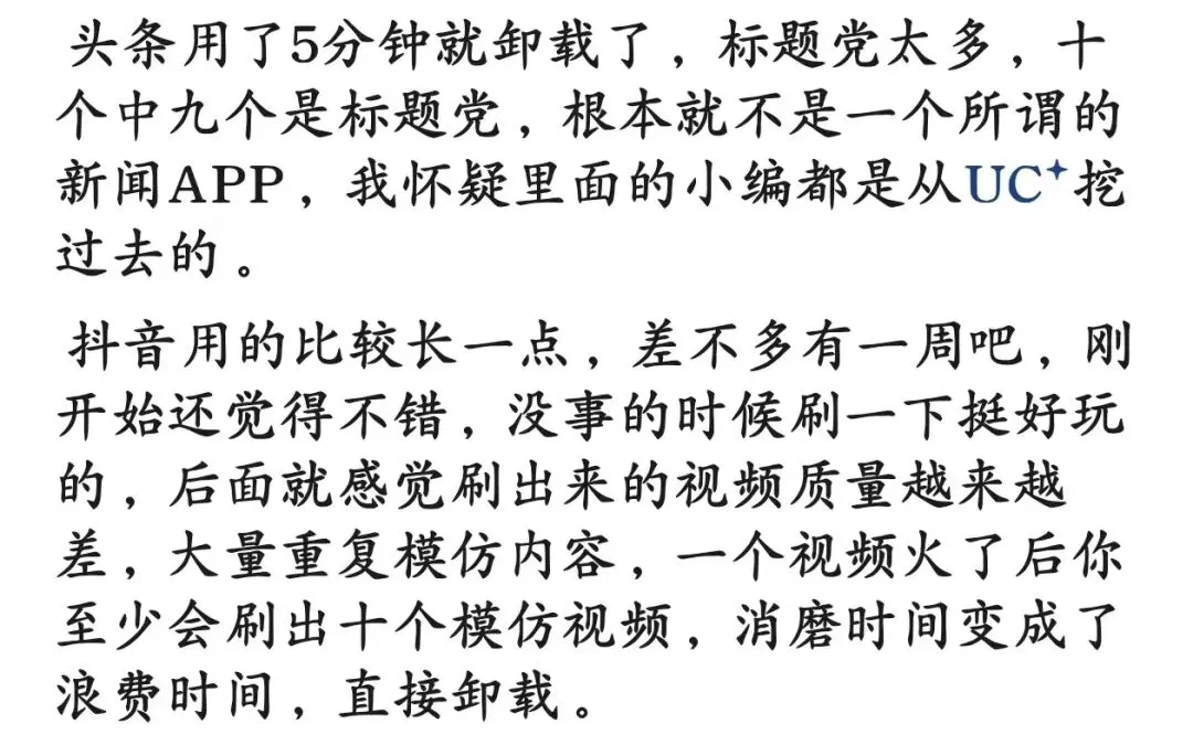 抖音早卸载了,今日头条还没卸,但很少看了,垃圾太多。知乎也有这种趋势了,哎