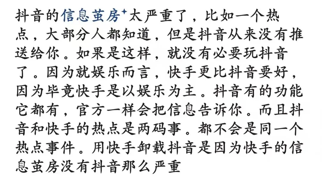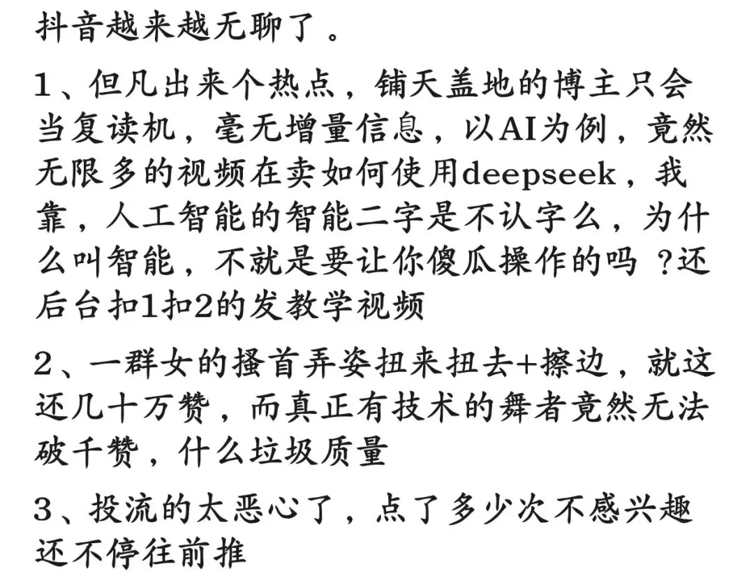 抖音最大的弱点,我觉得可能就是“没营养”吧,毕竟视频时间太短,大部分视频都没什么实际内容。还有就是重复性内容太多,一个东西火了,马上有大量人模仿,这也是抖音外放惹路人讨厌的原因,某几首BGM无限循环,肯定惹人厌啊,其他APP就没这种烦恼,你外放路人也不知道你在用什么APP。
